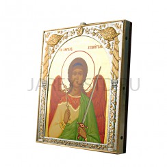 Икона в белой деревянной рамке, белый багет с золотым узором, полиграфия