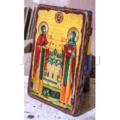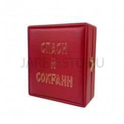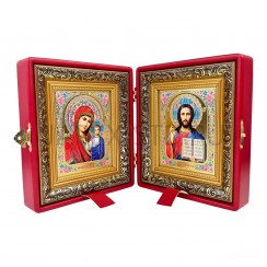 Складень ручной работы «Венчальная пара» с иконами "Спаситель, Казанская" .Двойной футляр из экокожи. Створки подвижные, футляр закрывается с помощью металлической застежки. Иконы выполнены на древесном полотне с приклеенной пластмассовой рамкой. Имеется текстильный язычок, потянув за который можно вытащить икону из футляра.