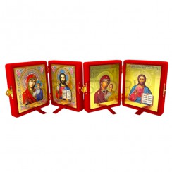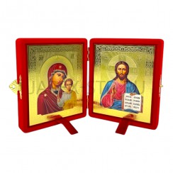 Складень с ликами Святых " Спаситель" и "Казанская Икона Божьей Матери", основа складня выполнена из деревянного материала, каждый лик вынимается , лик вставлен в багетную рамку и в фигурную ризу