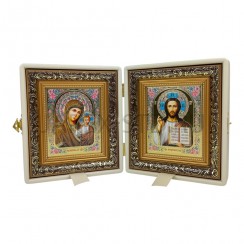 Складень ручной работы «Венчальная пара» с иконами "Спаситель, Казанская" .Двойной футляр из экокожи. Створки подвижные, футляр закрывается с помощью металлической застежки. Иконы выполнены на древесном полотне с приклеенной пластмассовой рамкой. Имеется текстильный язычок, потянув за который можно вытащить икону из футляра.