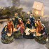 Миниатюра на подставке из декоративного камня. Под сводами хлева Младенец в яслях. Коленопреклоненная Мария слева от яслей, Иосиф стоит справа. Иосиф склониля к Младенцу, в руке он держит фонарь. Фигуры Святого семейство ярко освещает подсветка