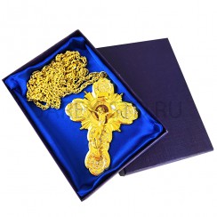 Наперсный крест длинна цепи 124см, размер креста -18см. Атрибут священника и архиерея. Его носят поверх подрясника, рясы или облачения. Он имеет довольно большой размер – значительно больший, нежели у нательного креста. Наперсный крест носят на особой цепи. Форма и декор наперсного креста в современной церковной практике довольно строго регламентированы. Ношение священником наперсного креста не отменяет ношения им креста нательного. Это – два разных предмета, не заменяющих друг друга: нательный крест является обязательной принадлежностью православного христианина в Русской и многих других поместных православных церквях. Наперсный крест возлагают на священника при его рукоположении (посвящении в сан). Слово «наперсный» означает «носимый на персях», т.е. на груди.