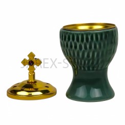 Кадильница металлическая золотого цвета, высокого качества и оригинальной овальной формы. Безопасна в эксплуатации. Можно использовать в открытом и закрытом виде. Состоит из емкости под уголь и крышки с удобной ручкой в виде резного креста для открывания. Украшена бежевой эмалью и золотым рисунком в виде цветка со стразами. Имеет отверстия для выделения ароматного дыма. Без ручки. Высота 8 см. Продается упаковками из 1 шт.